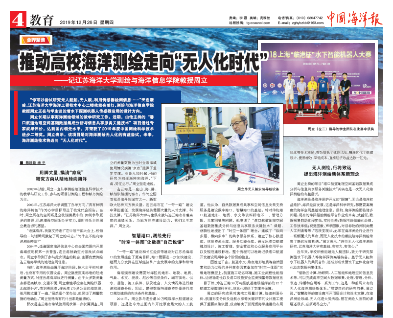 周立长期从事海洋测绘领域的教学研究工作。近期,由他主持的“港口航道地理空间基础数据集成分析与信息共享服务关键技术”项目通过专家成果评价,达到国内领先水平,并荣获了2019年度中国测绘科学技术进步二等奖。周立表示,该项目是对海洋测绘无人化的有益尝试,未来,海洋测绘技术将迈向“无人化时代”。