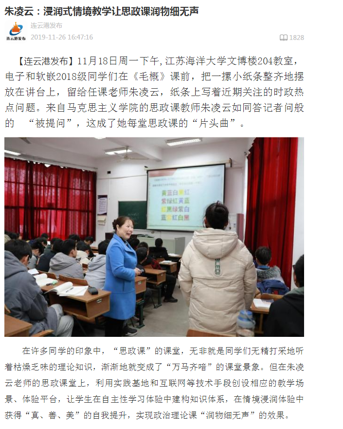 朱凌云的教学团队非常注重研究互联网+智慧教育背景下的思政课“浸润式”情境教学,尝试着将情境模拟教学法带入课堂。学生的参与度非常高,就连刚刚听完她讲课的江苏海洋大学党委书记王自力都说,“我整堂课都被吸引着。”