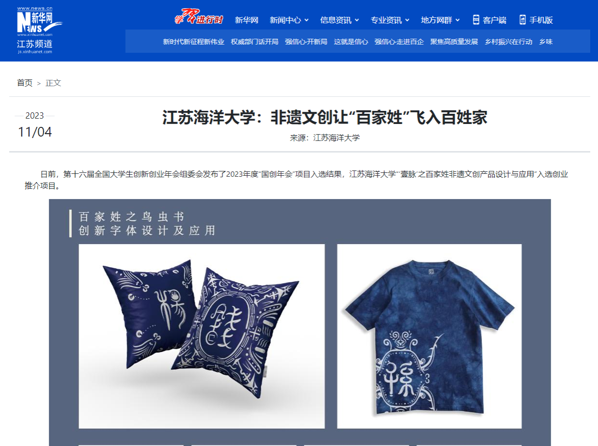 日前,第十六届全国大学生创新创业年会组委会发布了2023年度“国创年会”项目入选结果,江苏海洋大学“‘壹脉’之百家姓非遗文创产品设计与应用”入选创业推介项目。